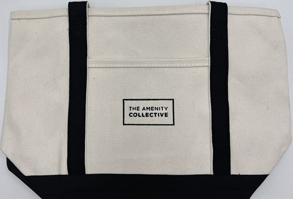 • Made of 24-oz. cotton canvas• Front Pocket• 30" Handles• Spot Clean/Air Dry• Black straps and bottom• Logo: The Amenity Collective
